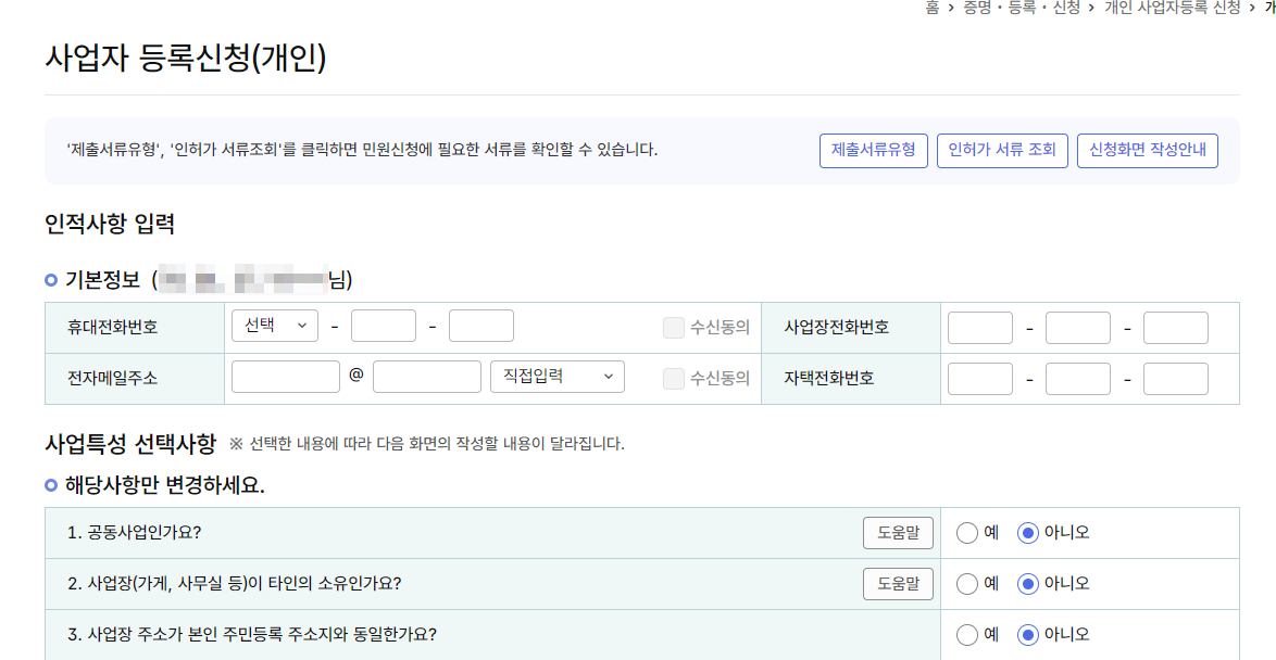 - 개인정보, 사업장 주소, 업종코드 등 필수 항목 입력